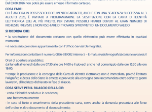 CHI È ANCORA IN POSSESSO DI DOCUMENTO CARTACEO, ANCHE CON UNA SCADENZA SUCCESSIVA AL 3 AGOSTO 2026, È INVITATO A PROGRAMMARNE LA SOSTITUZIONE CON LA CARTA DI IDENTITÀ ELETTRONICA (CIE) AL PIÙ PRESTO, PER EVITARE POSSIBILI RITARDI DOVUTI AL GRAN NUMERO DI RICHIESTE PREVISTE E NON RISCHIARE DI TROVARSI SPROVVISTI DI UN DOCUMENTO VALIDO.
