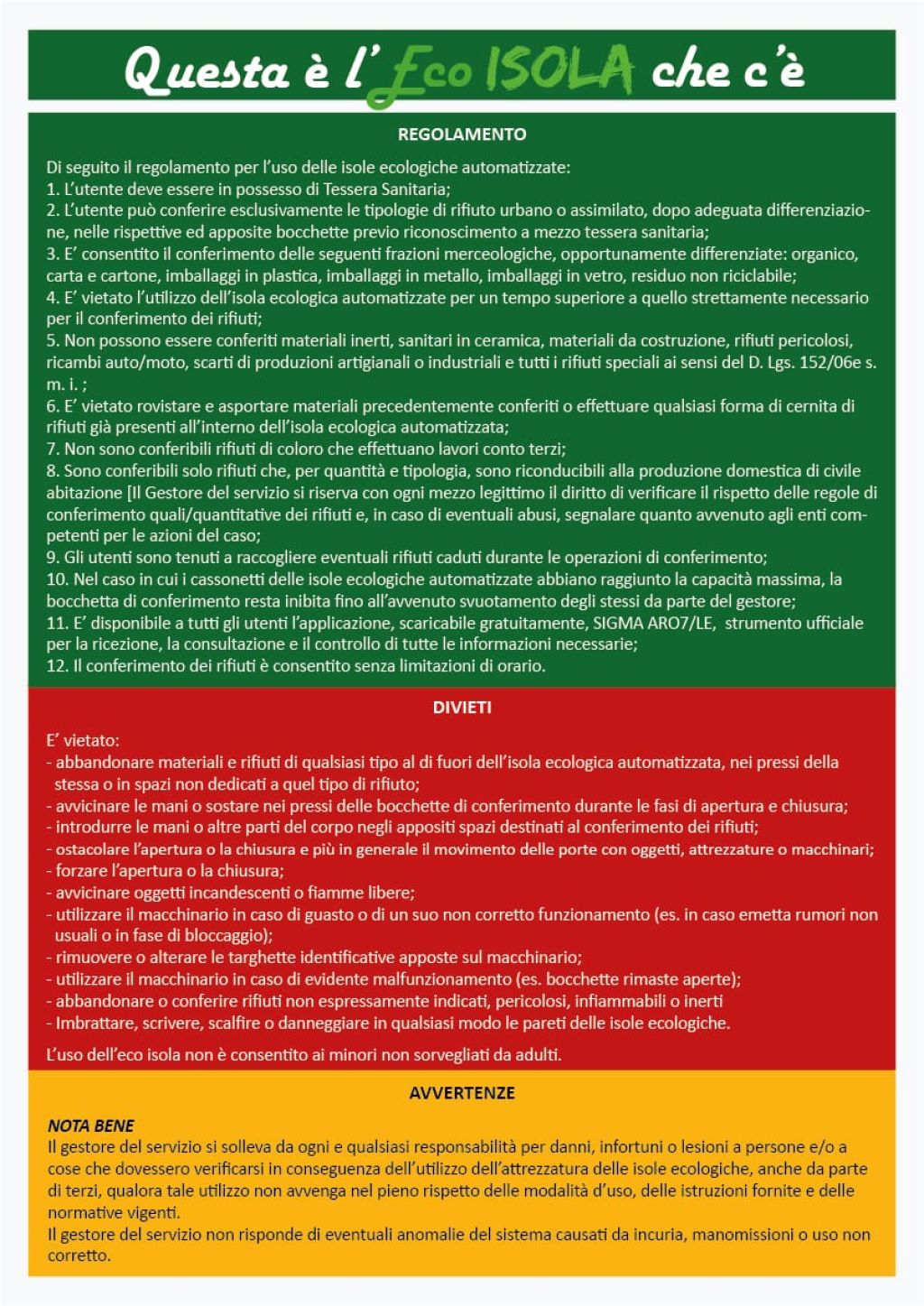 Per conoscere il regolamento completo e localizzare tutte le isole, è disponibile l’app SIGMA ARO LE7 (gratuita per Android al link: https://play.google.com/store/apps/details... ).
